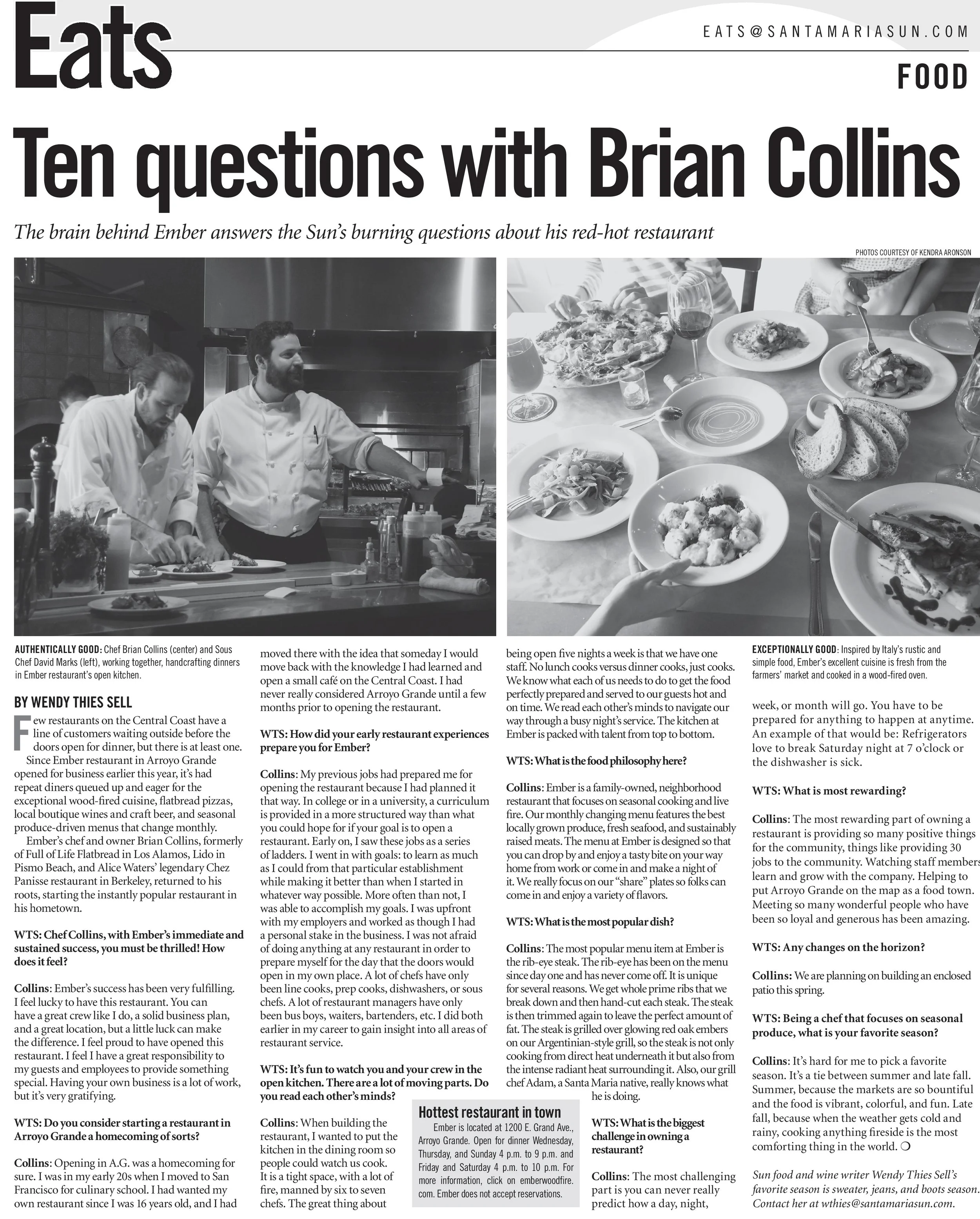 "Brian Collins, who opened Ember with his wife, Harmony, in Arroyo Grande less than two years ago, began as an intern at Chez Panisse while attending San Francisco’s California Culinary Academy. He was offered a full-time job and stayed for six years. Ten years ago, he returned south and worked at restaurants in the area before opening a place that would make Alice Waters proud. He said it took a while before he felt comfortable that the area would support a restaurant where much of the food comes out of the wood-fired oven. 'We’re right in the middle between Los Angeles and San Francisco,' he said. 'With the quality of wines increasing, there’s a parallel demand for high-quality food. Those two go hand in hand.'”—SAN FRANCISCO CHRONICLE